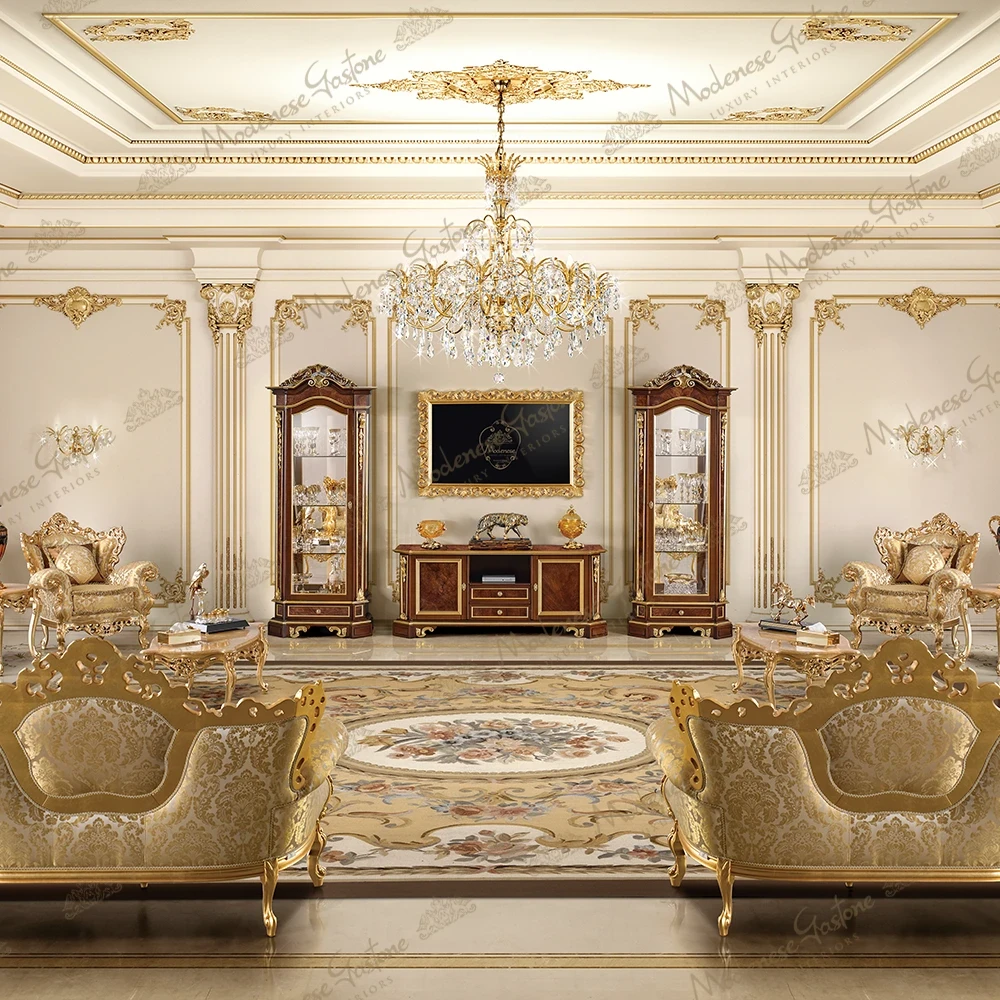 The living room design by Modenese Luxury Interiors features luxury wall panels with gold-plated embellishments that harmonize beautifully with the fabric of the sofa and armchairs with characteristic curved legs with beautiful carvings. Baroque consoles and coffee tables constructed of solid wood complement the furnishings.