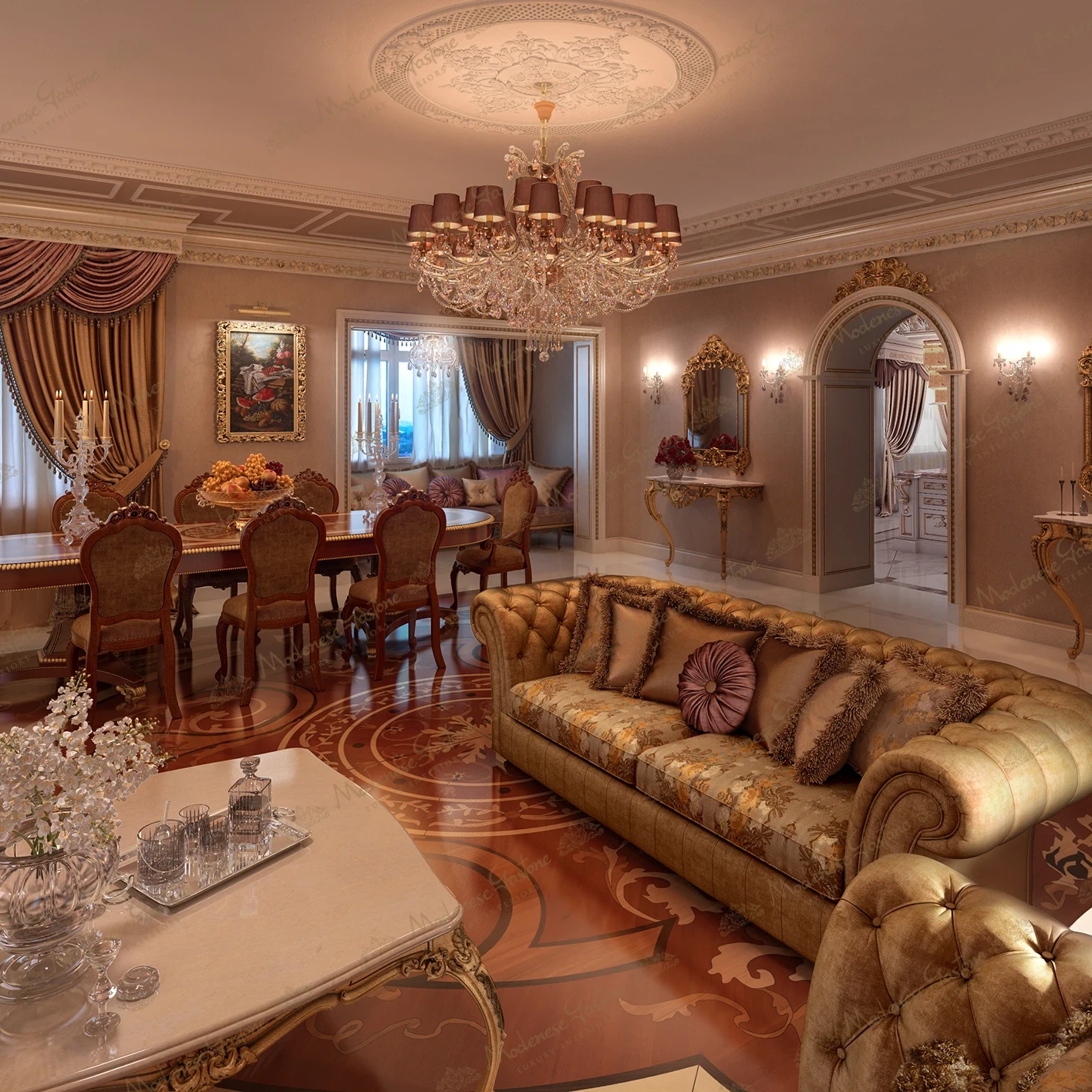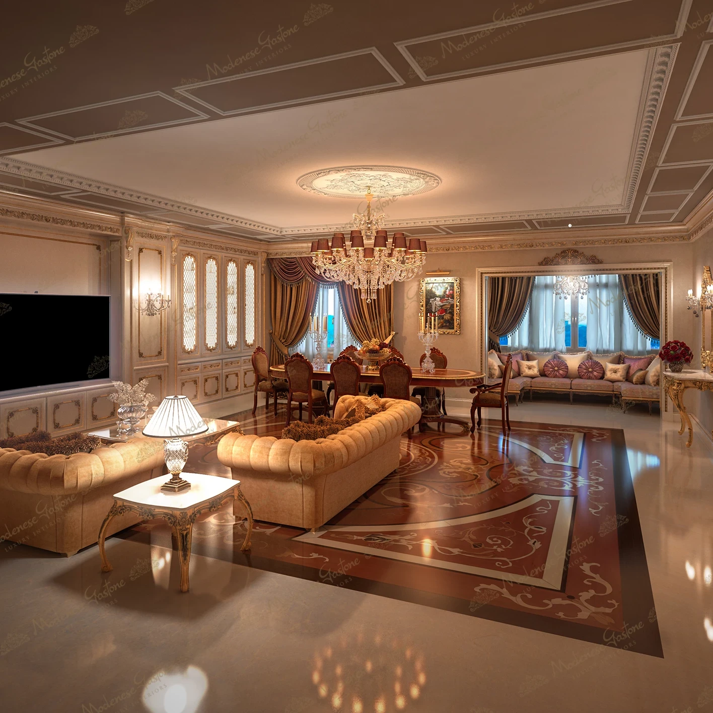 Nos espaces communs, tels que le hall d’entrée, les salons et les salles de réunion, sont meublés avec des pièces haut de gamme de Modenese, utilisant des matériaux riches comme le marbre, le velours et le cristal.